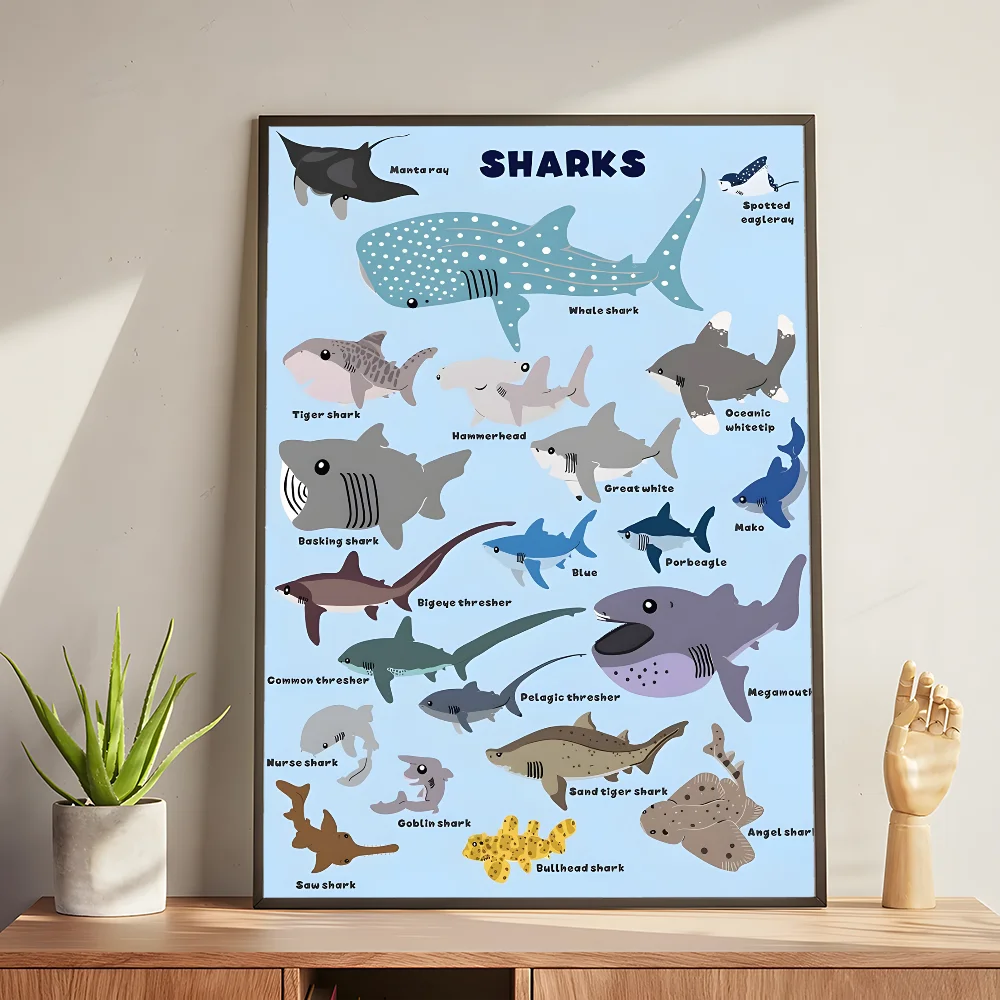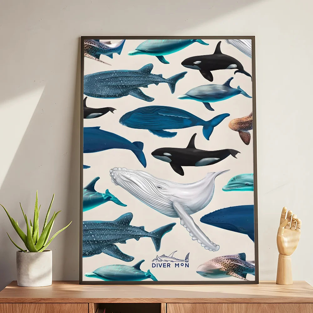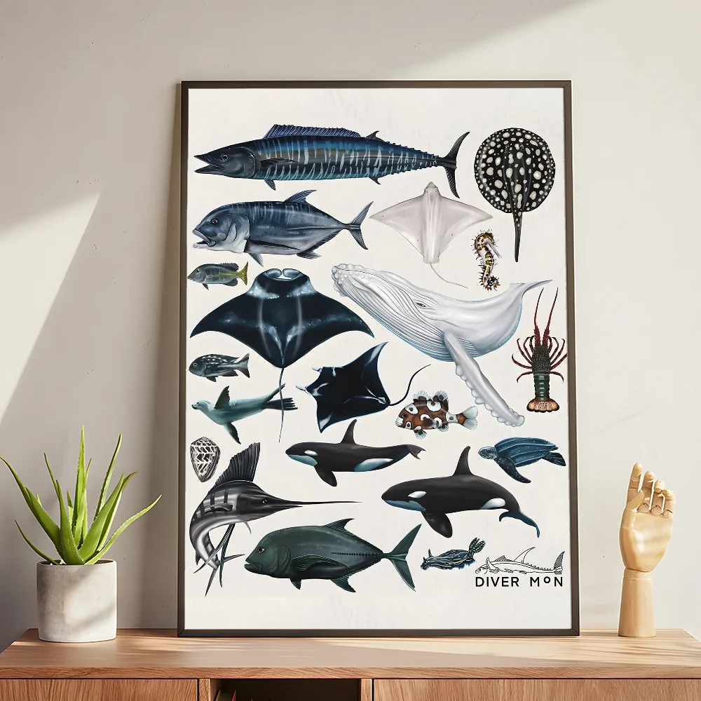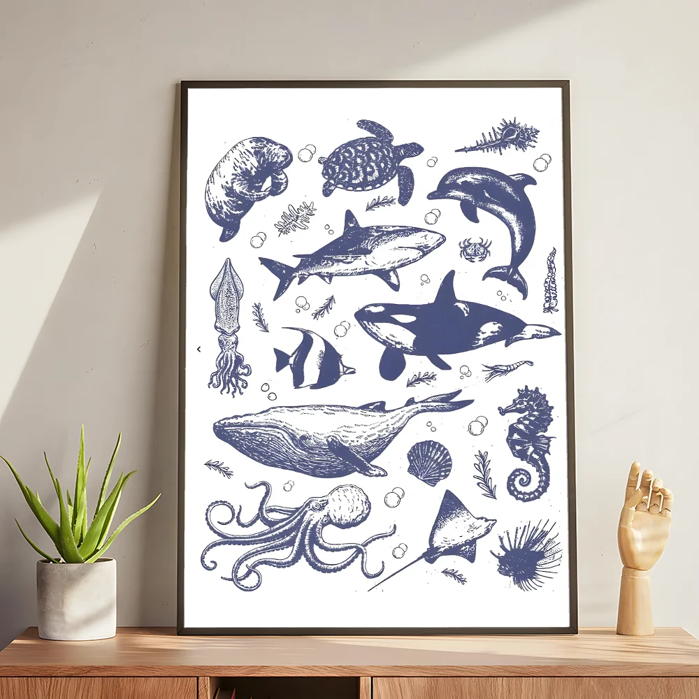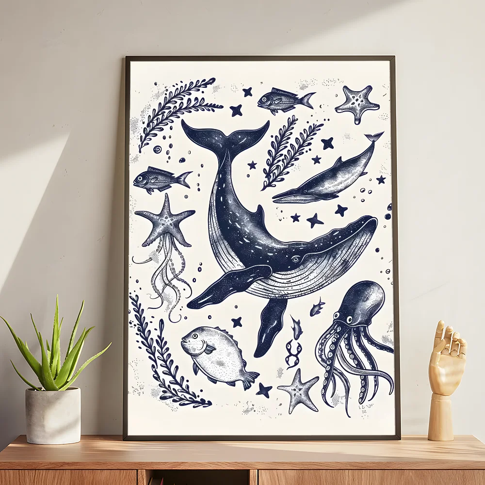 Whale and Shark Seashells Turtles Octopus Fish Marine Life Ocean Animals Poster HD