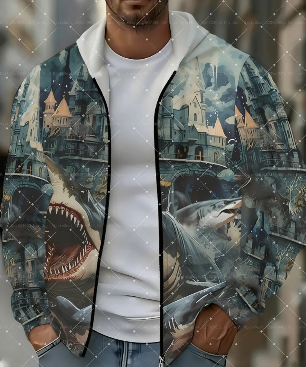 Men'S Shark Castle Print Hoodie Winter Zip-Up Jacket